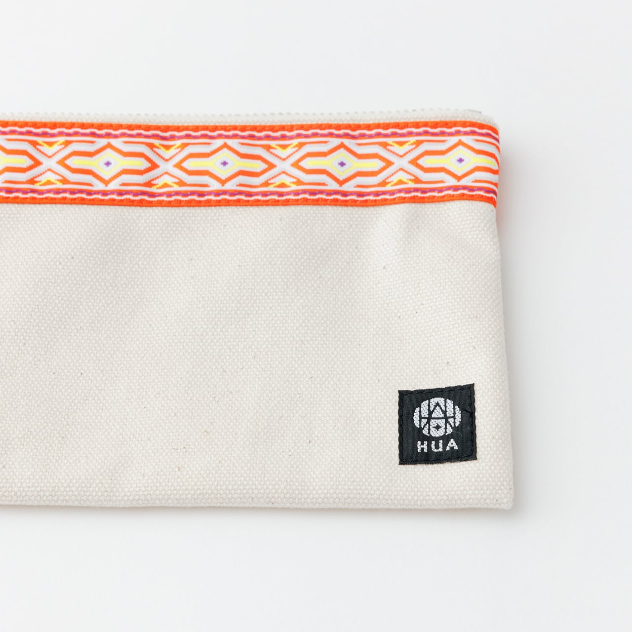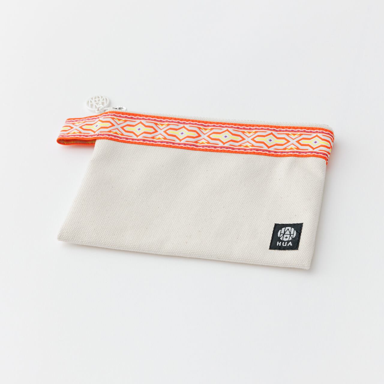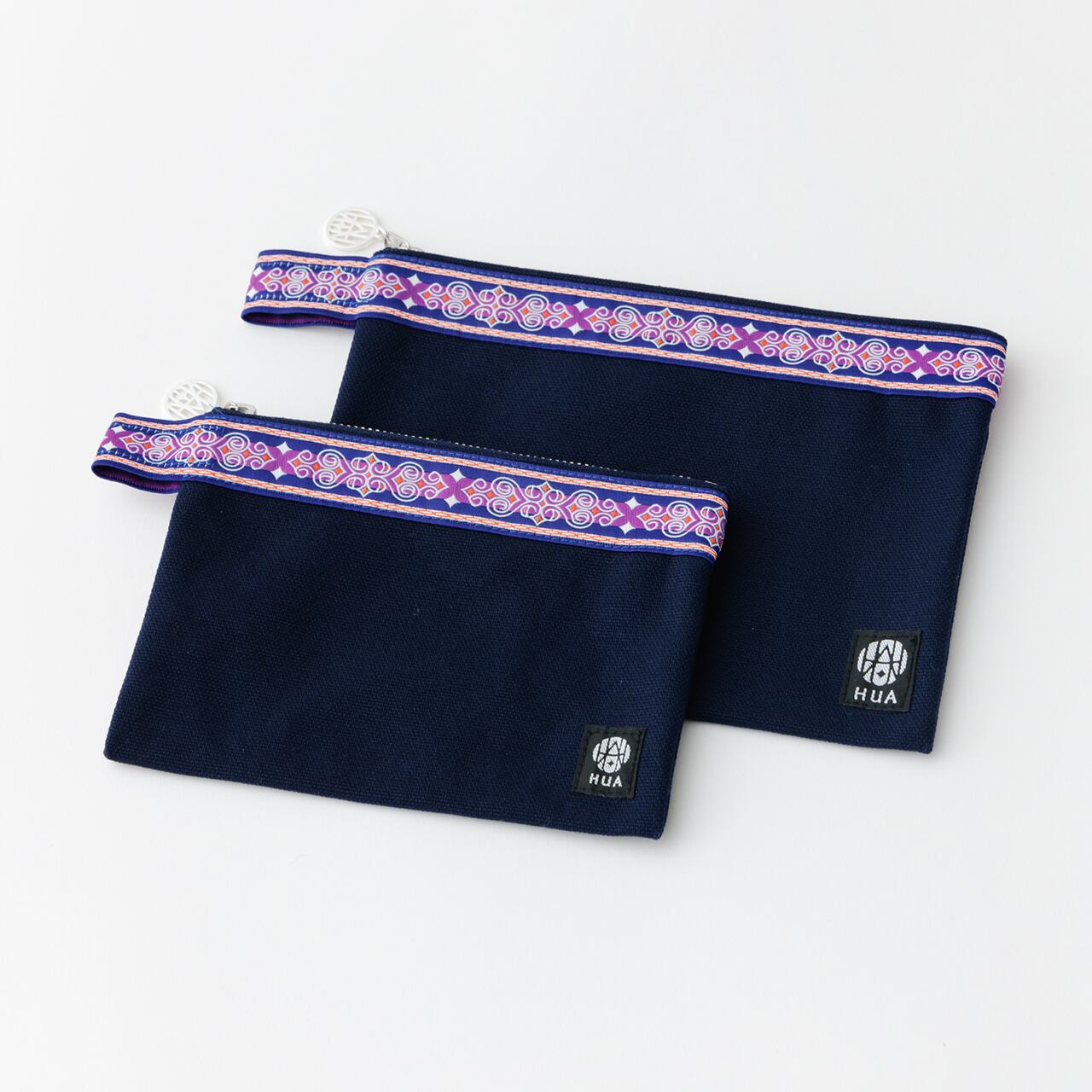 アイヌ文様[エムシアツ][プンキネ]のチロルテープでファスナー部分を強化した帆布製の平ポーチ。マチのないデザインで鞄にスッキリ納まります。