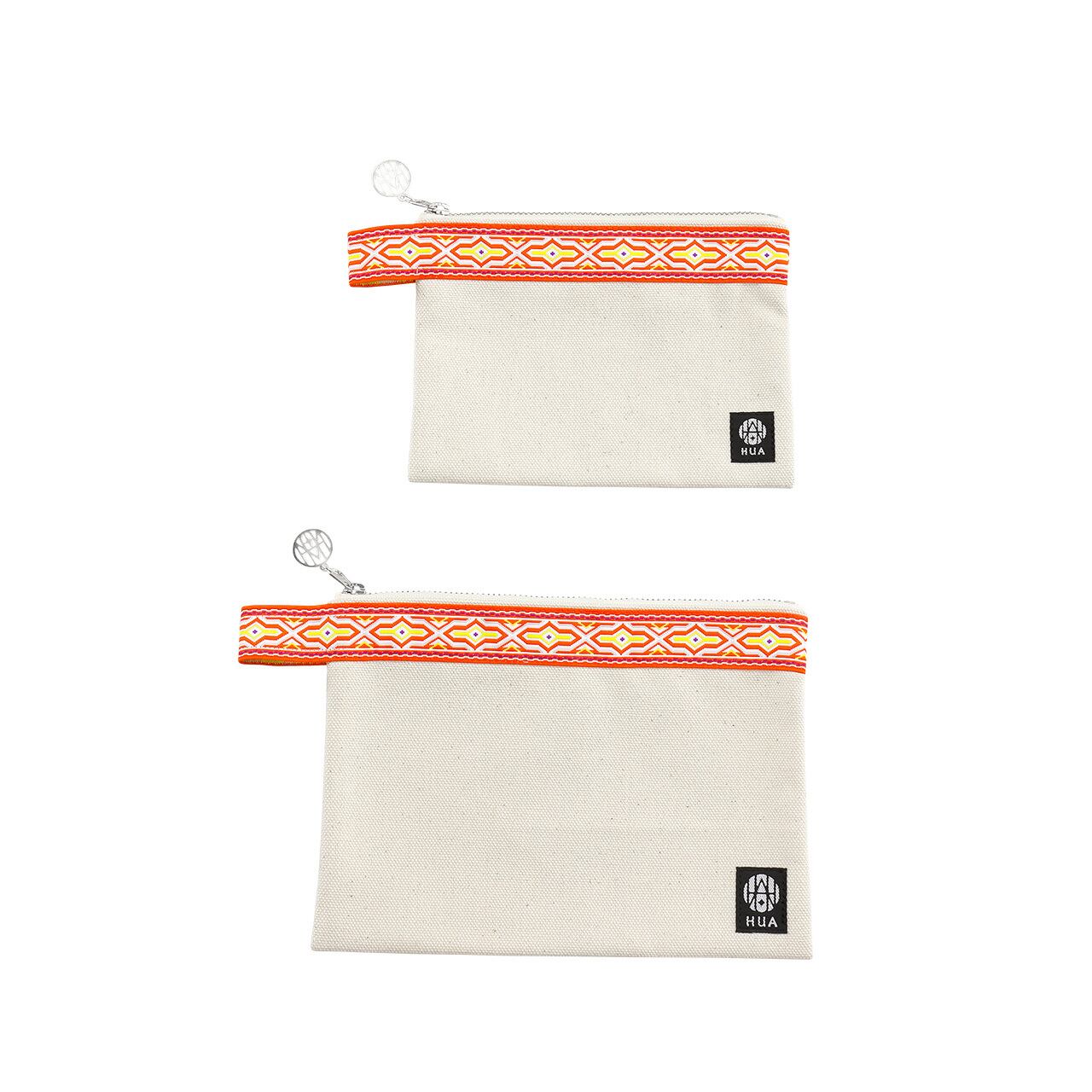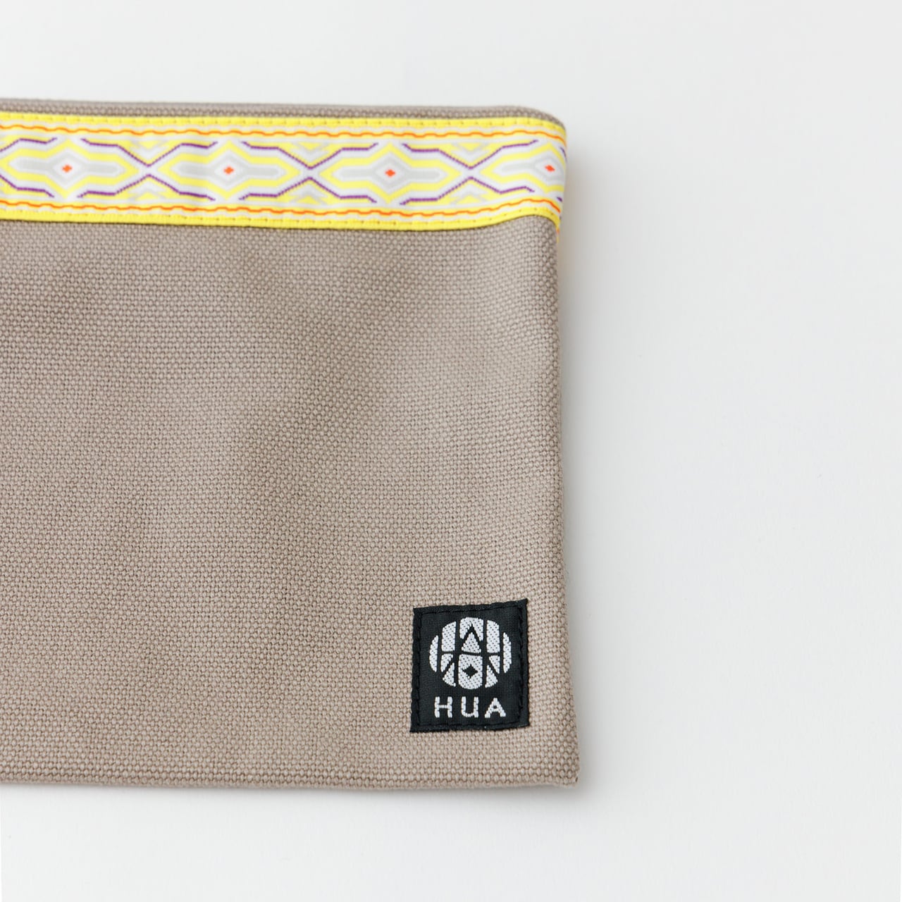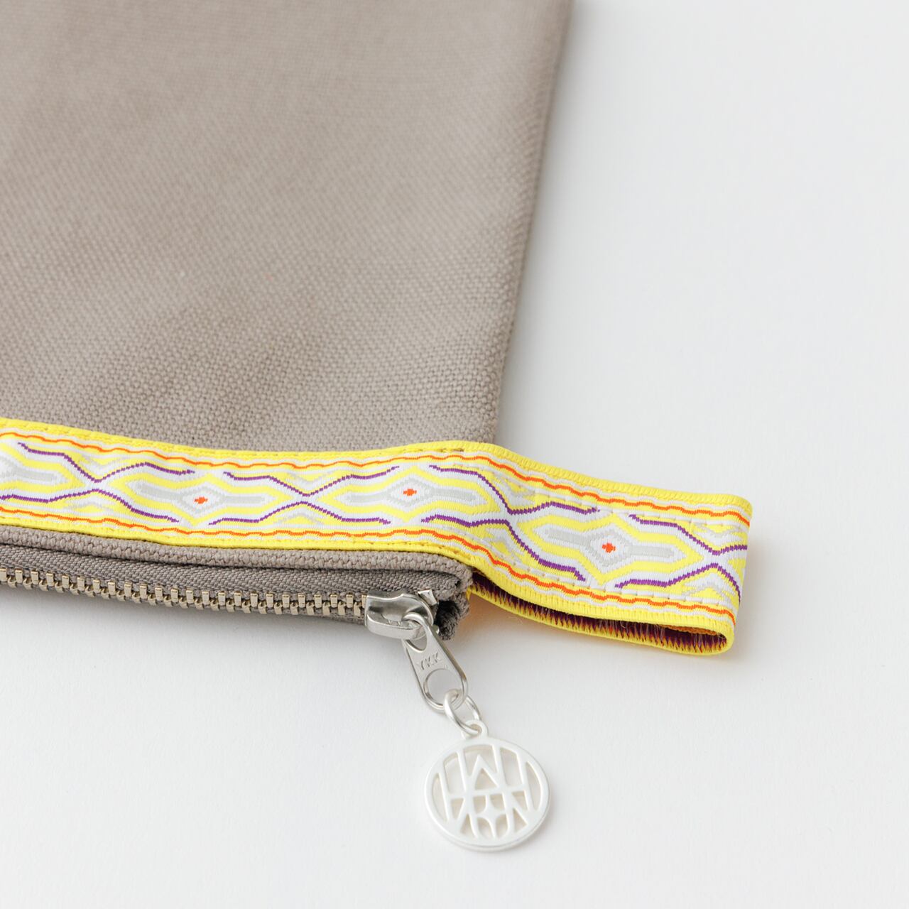 アイヌ文様[エムシアツ][プンキネ]のチロルテープでファスナー部分を強化した帆布製の平ポーチ。マチのないデザインで鞄にスッキリ納まります。