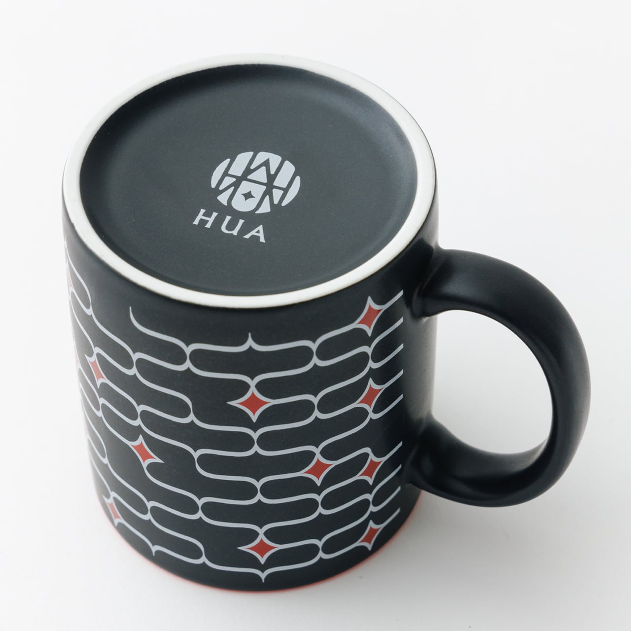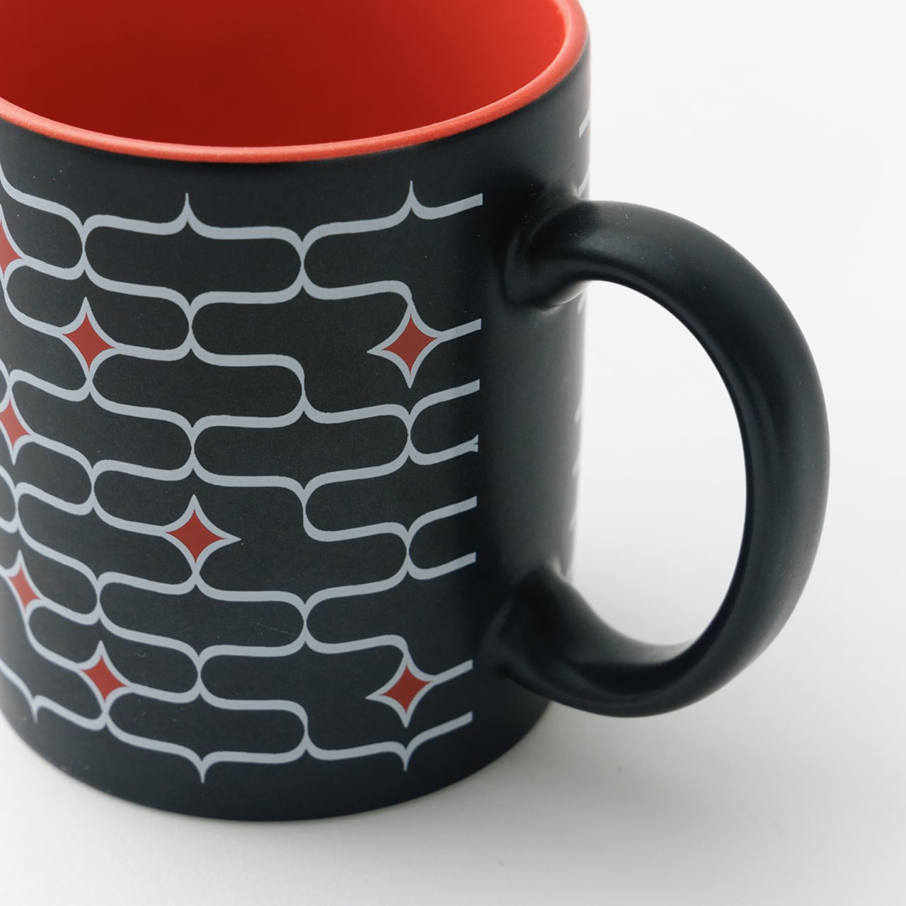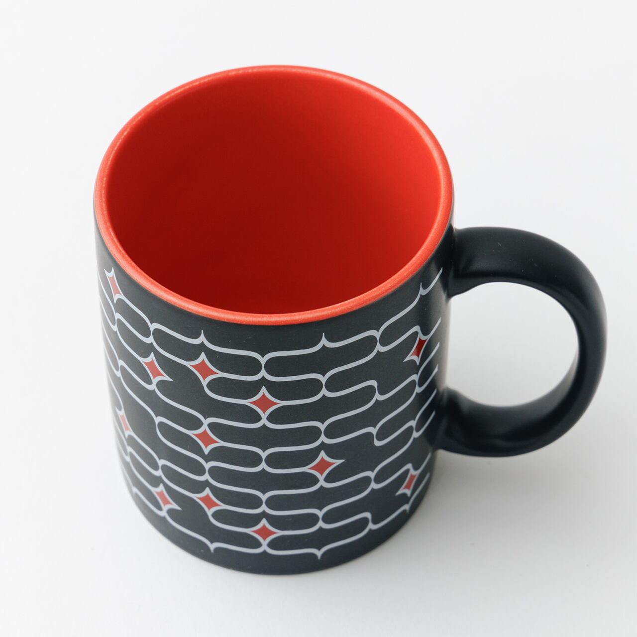 美濃焼で有名な岐阜県の工場で製造したアイヌ文様のマグカップ。バイカラーの個性的なデザインに仕上がりました。日常使いしやすい大きさで、アイヌ文様が日常に溶け込みます。